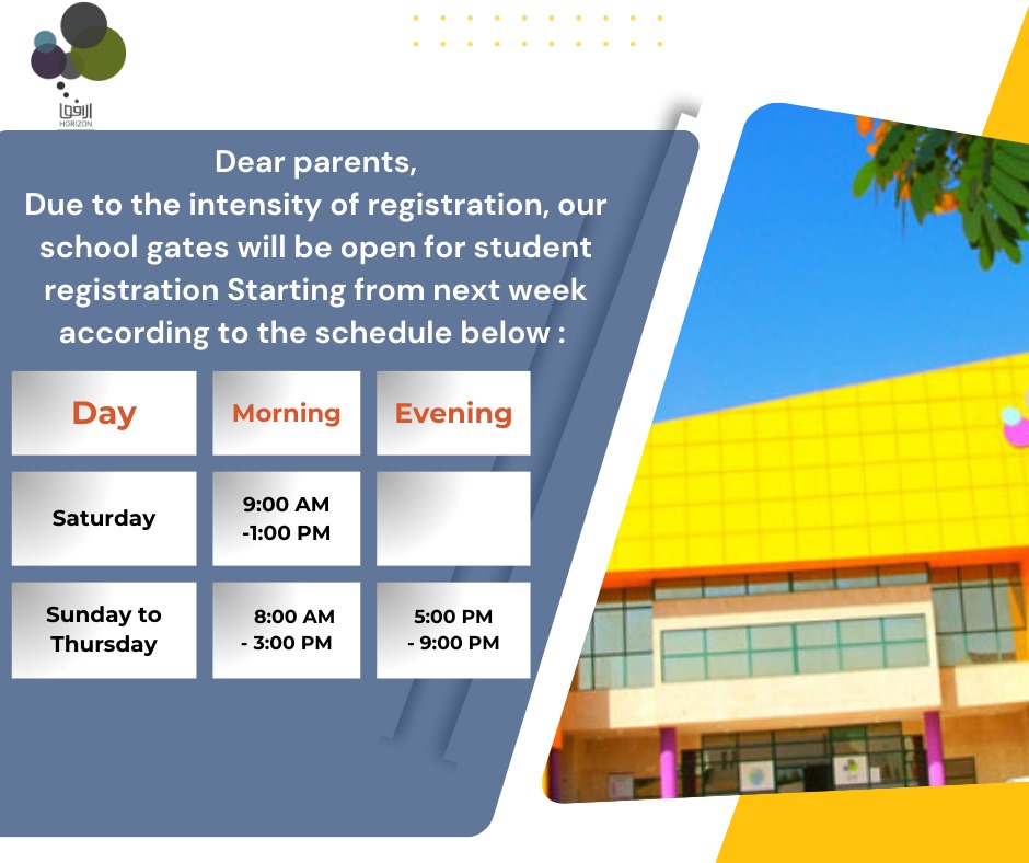 Dear Parents , Due to the intensity of registration , our school gates will be open for student registration starting from next week according to the schedule below .